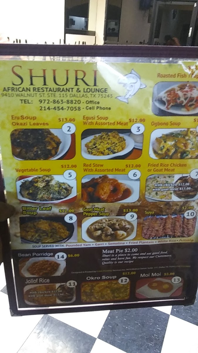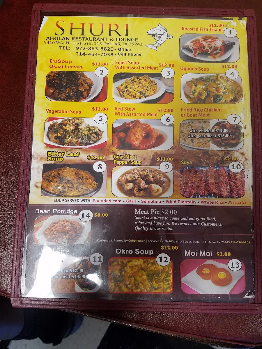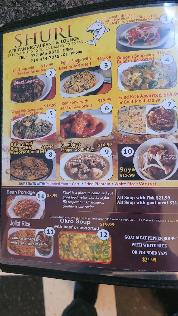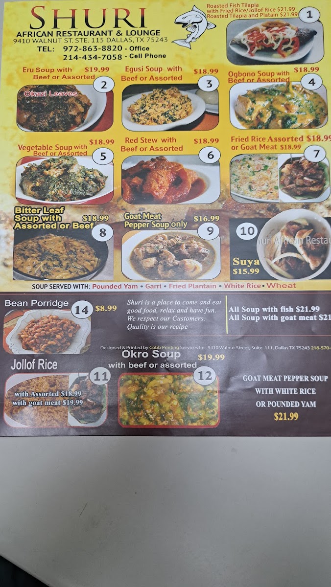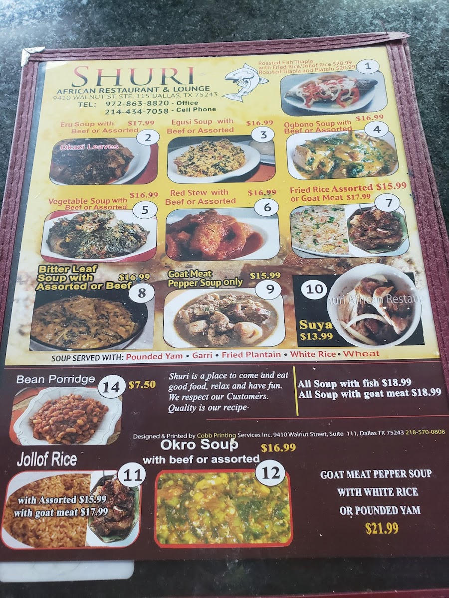 Welcome to Shuri African Restaurant, where authentic African cuisine bursts forth in vibrant flavors. Nestled in Dallas, this culinary gem offers a diverse menu that captures the essence of traditional dishes. From the Roasted Fish Tilapia served with fried or jollof rice, to the savory joys of Goat Meat Pepper Soup, Shuri invites you to savor every bite. The Egusi and Vegetable Soup stand out as hearty options that showcase dedication to fresh ingredients and authentic techniques.