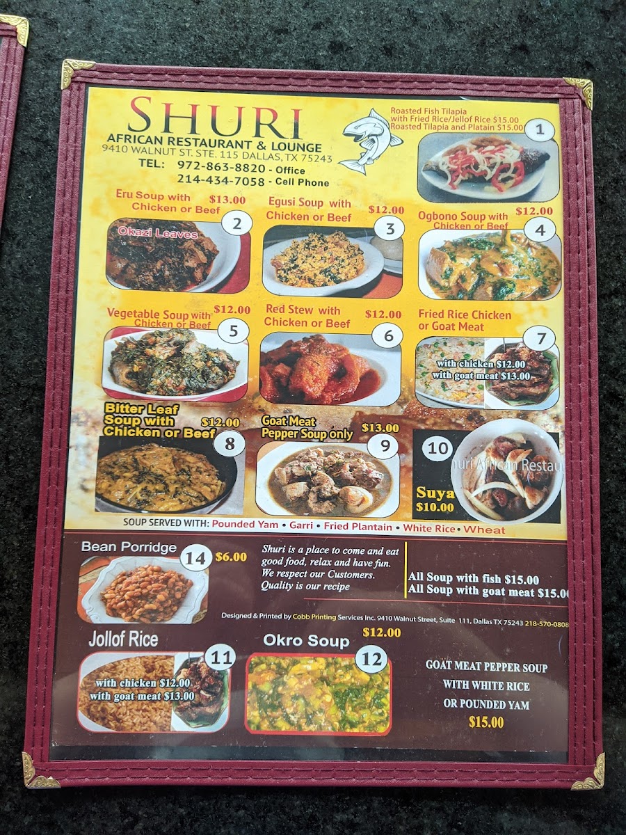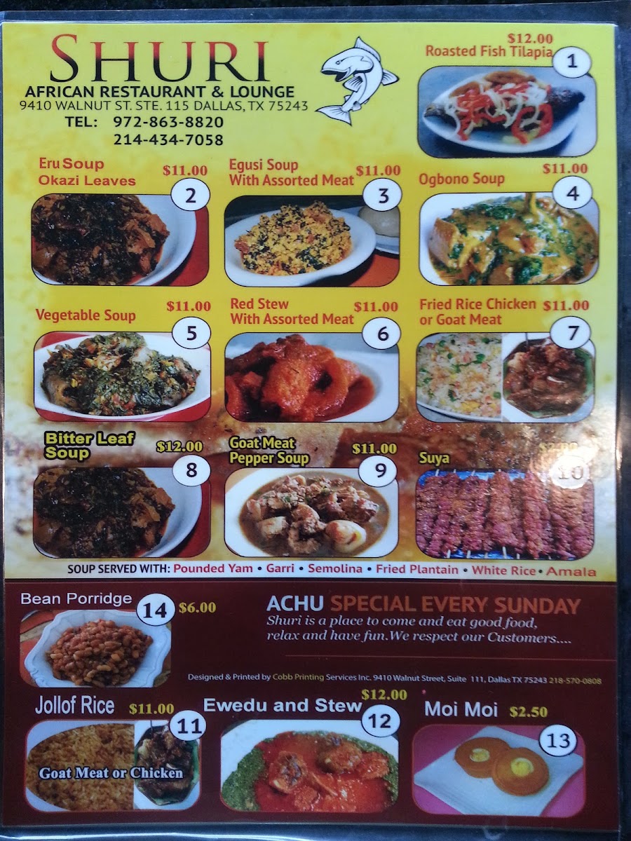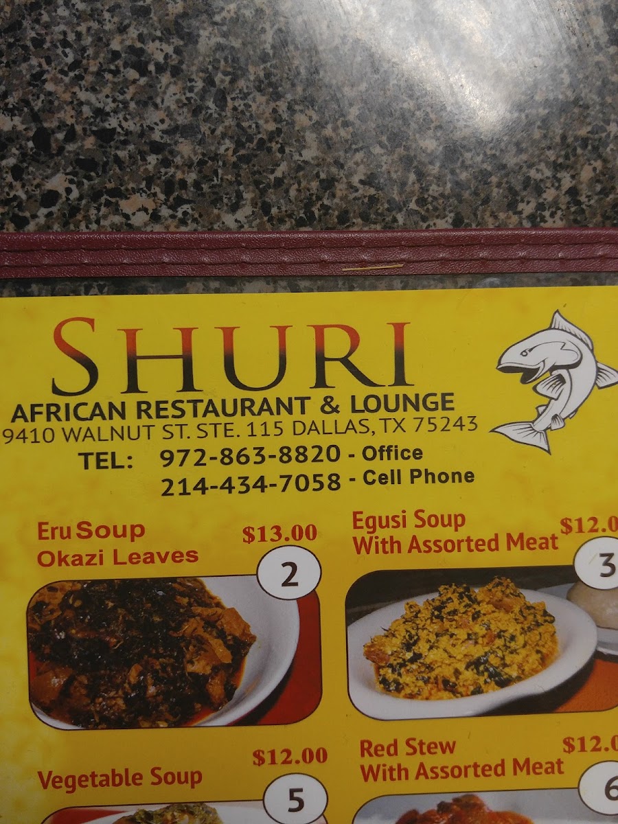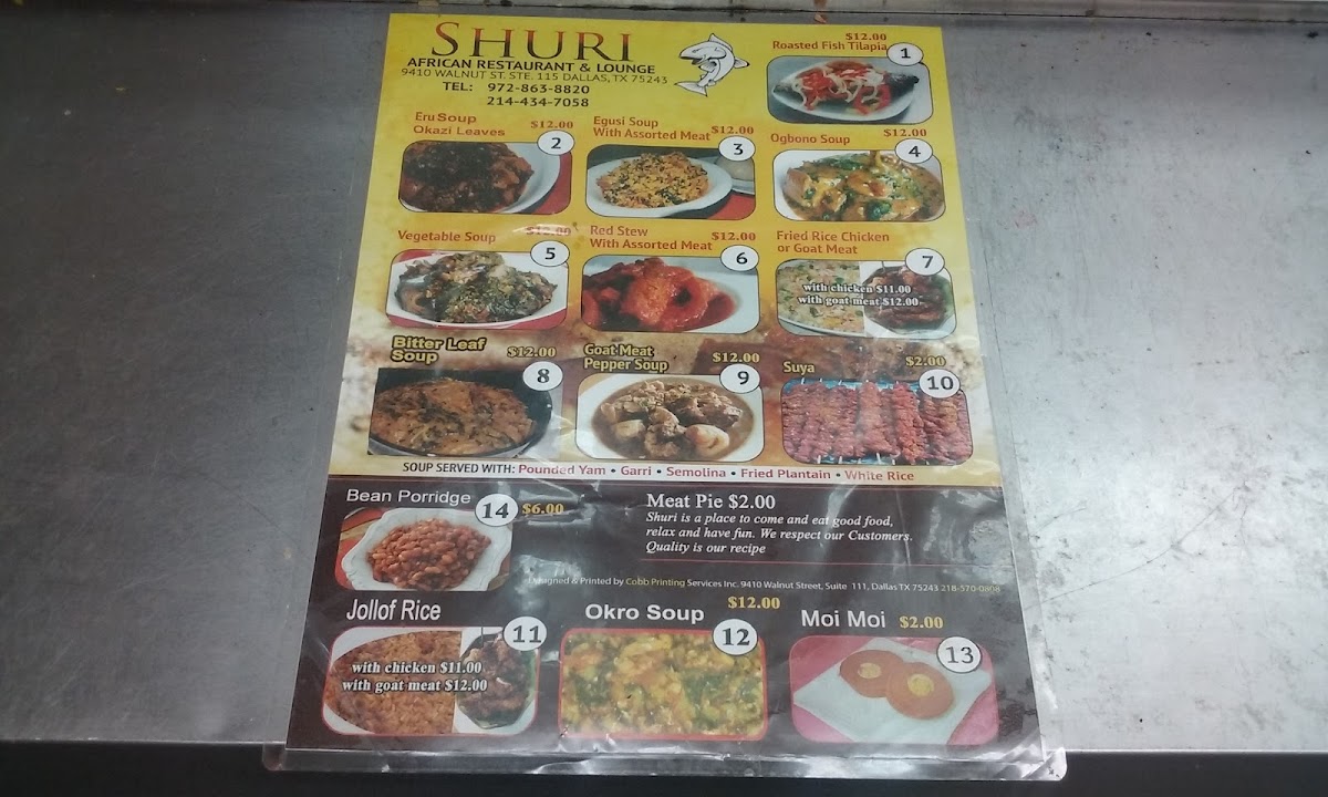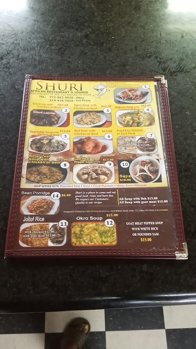 Welcome to Shuri African Restaurant, where authentic African cuisine bursts forth in vibrant flavors. Nestled in Dallas, this culinary gem offers a diverse menu that captures the essence of traditional dishes. From the Roasted Fish Tilapia served with fried or jollof rice, to the savory joys of Goat Meat Pepper Soup, Shuri invites you to savor every bite. The Egusi and Vegetable Soup stand out as hearty options that showcase dedication to fresh ingredients and authentic techniques.